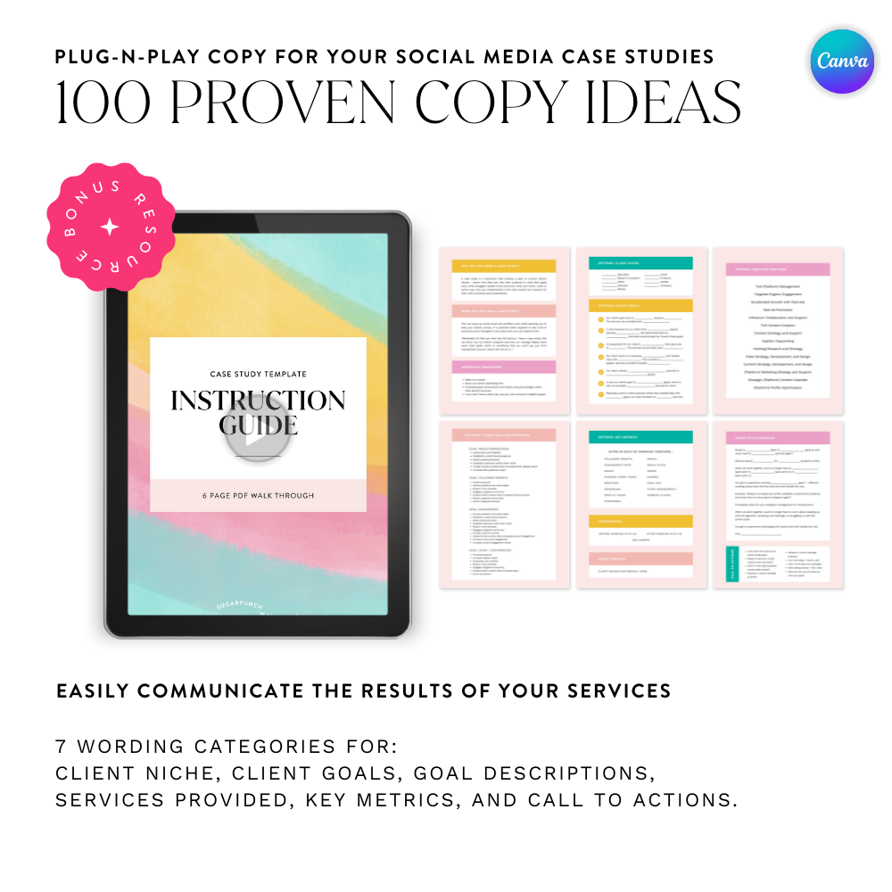Showcase your social media success stories with the Social Media Case Study Template—a customizable Canva template designed to make client results visually compelling and easy to understand. Perfect for social media managers and digital marketers who rely on data-driven strategies, this 9-page template from Sugarpunch Marketing provides a polished, client-friendly format to present case studies that build trust and attract new clients.
